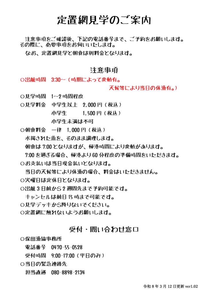 トップ > 【お知らせ】定置網漁見学が再開しました! お知らせ 2026.03.18 【お知らせ】定置網漁見学が再開しました! 長らくお待たせいたしました! 定置網漁見学の受付を再開いたします! ご案内にお目通しいただき、ご予約をお願いします🐟 前の記事